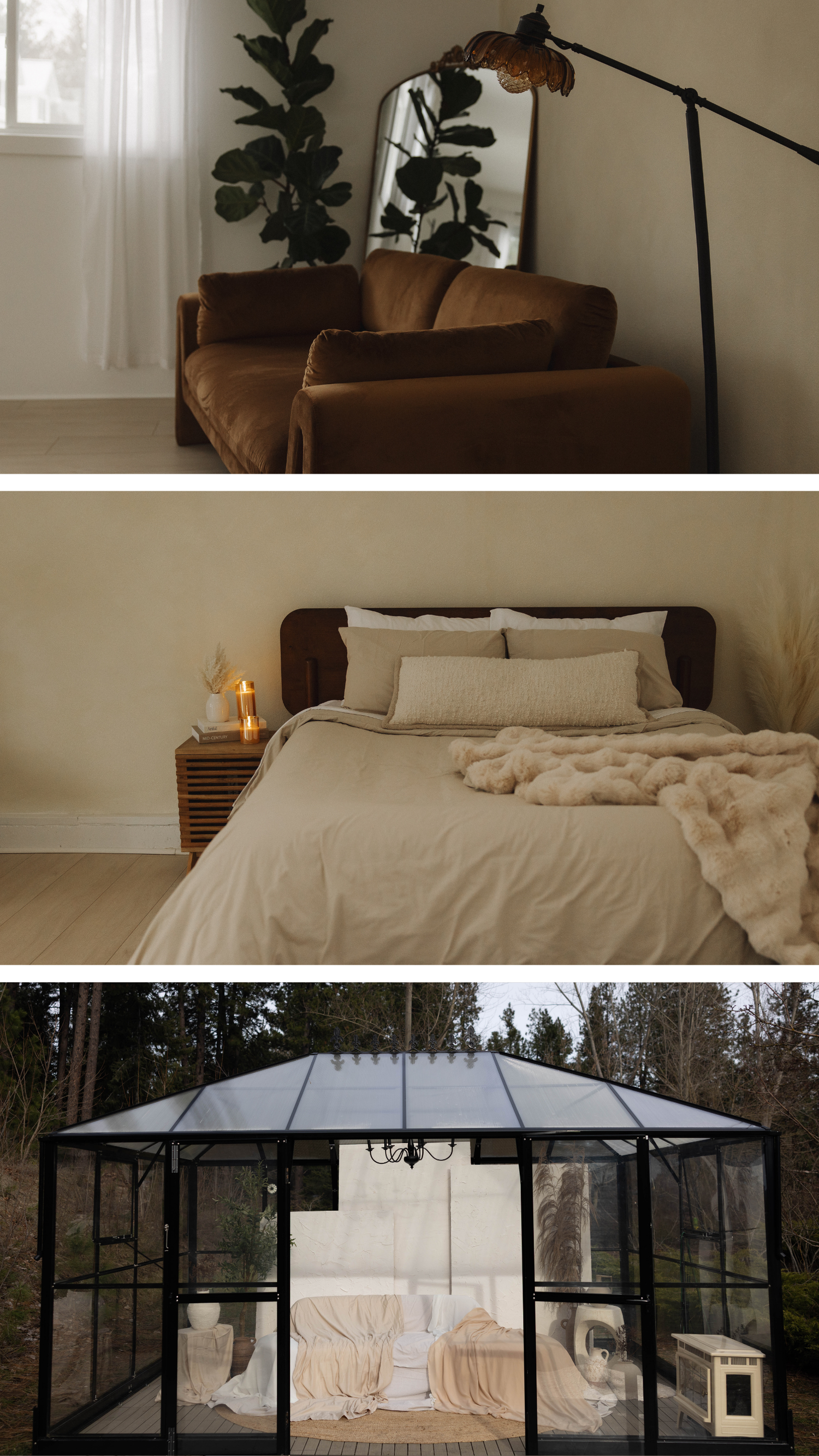 A soft neutral bedroom escape layered with linens, plush textures, and candle-glow warmth. Romantic, gentle, and organic.